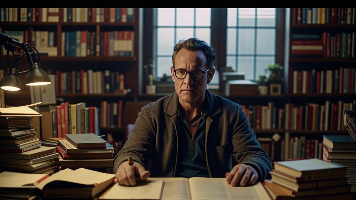 **Фотография**: **Мастер сидит в своей комнате, окружённый черновиками, книги разбросаны повсюду. В его глазах — горечь и отчаяние, но и свет надежды.**