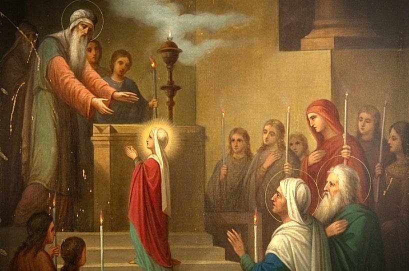 Год спустя праведная чета выполнила обещание. Торжественная процессия в сопровождении отроковиц с зажженными свечами подошла к Иерусалимскому храму. Здесь Пречистую Деву встретил первосвященник Захария в окружении иудейских священников.