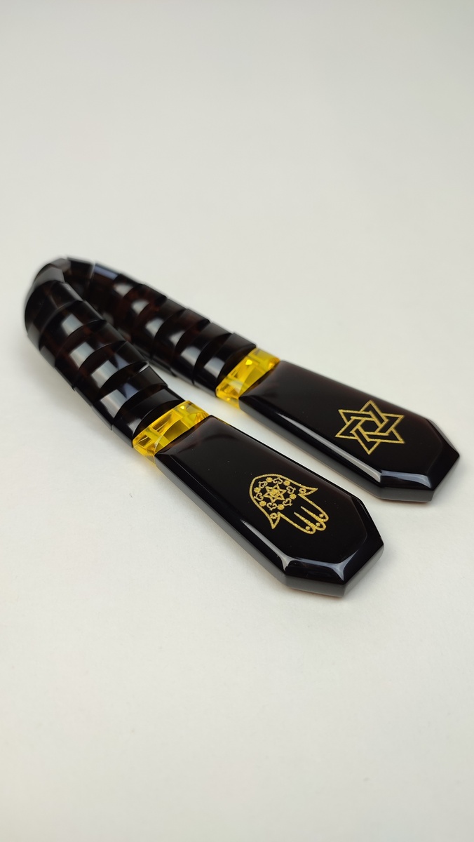 толщина ~ 8−8,5 мм. Гравировка нанесена на четыре поверхности из четырёх, содержит в себе два эскиза. Эти чётки выполнены в чёрном цвете с яркими янтарными вставками, которые создают тёплый контраст. Гравировка выполнена в солнечно-жёлтом цвете, подчёркивая глубокий смысл и символизм. Элегантность, стиль и философия — всё это объединено в этой модели. Чётки помогут настроиться на внутренний баланс, сосредоточиться и добавить спокойствия в каждый день. Следующие в этой серии: новые цветовые решения, сохраняющие единый символический стиль!