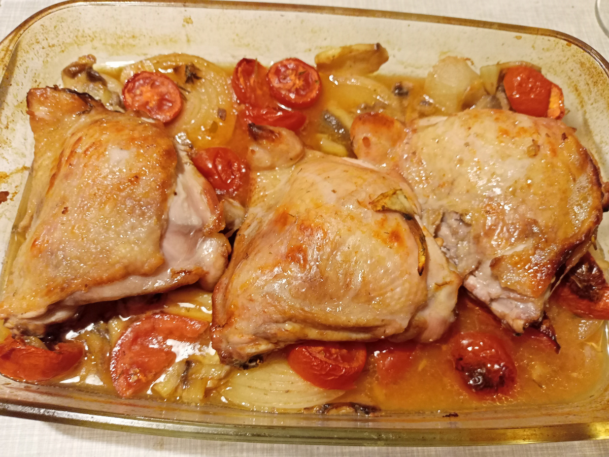 Уважаемые читатели, я уже описывал один рецепт маринада в томатном пиве. Но в этот раз я сделал немного по другому и уже с курицей. Ингредиенты: Куриные бёдра Томатное пиво Репчатый лук Грибы Помидоры Чеснок Способ приготовления: Начинаем мариновать. Положите бёдра в удобную ёмкость. Налейте 200 мл томатного пива в стакан и влейте его в мясо. Пиво должно покрывать курицу. Если пива мало, долейте ещё. Сверху можно положить нарезанный репчатый лук в виде колец. Ну и так же можно немного посыпать зеленушкой при желании. Оставляем мариноваться на 4-5 часов на кухне на столе. Прошло время маринада. Начинаем закладывать противень. Вниз выкладываем репчатый лук. Добавляем немного мороженных грибов. Так же нарезаем как вам нравится помидоры и выкладываем всё. Добавляем чесночка, лавровый лист. Солить и перчить мы не будем!!!!!! Это очень важно. В пиве, которое мы используем, уже достаточно соли и перца, и разных приправ. Поэтому при маринаде курица всем этим пропитается. Выложили мы овощи,