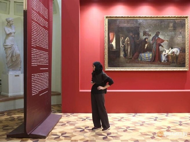 Начинать осмотр лучше с Екатерининского зала — это круглое помещение за торцом зала Тициановского (справа от входа в музей). Здесь показывают дипломные работы Ильи Репина и Василия Поленова (1844—1927) на тему «Воскрешение дочери Иаира» 1871 года. То был «звёздный выпуск» Академии художеств: сразу пять воспитанников получили Большие золотые медали, дававшие право на шестилетнее обучение за границей за счёт казны. Диплом Поленова хранится в МАХ, репинское полотно прибыло из Русского музея. Куратор выставки, директор Музея-усадьбы «Пенаты» Вера Ловягина уточняет, что обычно картины сравнивают не в пользу Поленова — его трактовка и правда более «приземлённая», даже жанровая, однако это дело вкуса. В том конкурсе Репин не сразу нашёл рембрандтовское решение света, которое в сочетании с нерембрандтовской сдержанностью живописи и даёт «духовность», которой нет в «жанре».