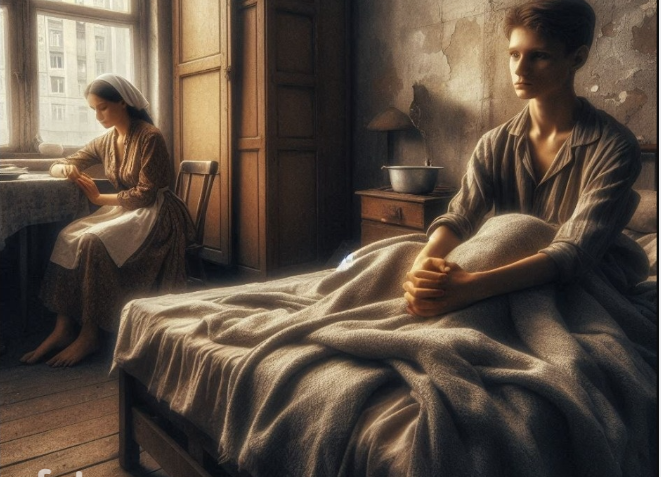 Родной берег 85 Таисья сидела рядом с сыном. Темные круги под глазами свидетельствовали, что она провело не одну бессонную ночь, но сейчас она тоже спать не могла. Мать смотрела на сына. Она не позволяла себе отвести взгляд даже на секунду, как будто одно мгновение невнимания — и он мог исчезнуть. Её руки дрожали. Не от холода — от чего-то большего. От невыносимого смешения радости и страха. Она осторожно касалась пальцами его волос, щеки, острой линии подбородка. «Живой... здесь...Ведь это же не сон?» Тишина заполнила комнату. Раньше она была густой, липкой. Сейчас в ней слышалось ровное дыхание сына. Таисья поднялась: надо было задуть лампу, керосин приходилось экономить. Под её ногами скрипнула половица, она вздрогнула от резкого звука. Тусклая лампа отбрасывала на стены мерцающие тени. Эти тени двигались, словно что-то невидимое пряталось в углах, рождая в воспаленном мозгу страшные мысли. Таисья сопротивлялась, нет они больше не утянут в пустоту её мальчика. В памяти снова вспл