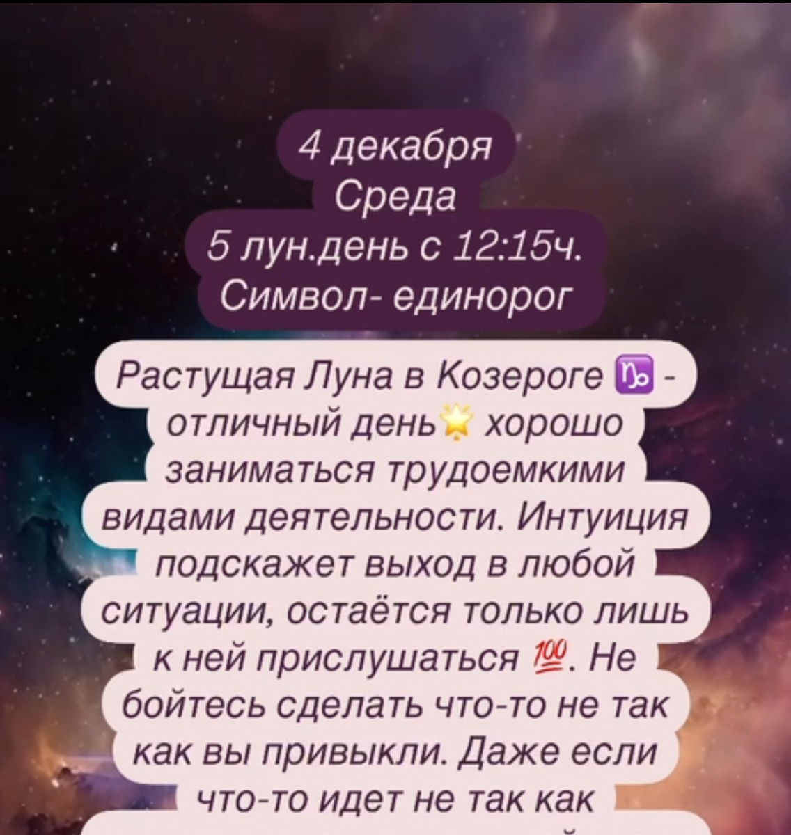 Растущая Луна в Козероге ♑️ - отличный день🌟 хорошо заниматься трудоемкими видами деятельности. Интуиция подскажет выход в любой ситуации, остаётся только лишь к ней прислушаться 💯. Не бойтесь сделать что-то не так как вы привыкли. Даже если что-то идет не так как запланировали, принимайте все 💖 как есть и вдохновение обязательно посетит вас. Сны - предупреждающие. Если снятся родители, то могут предупредить об опасности ✅стрижка ✅покупки