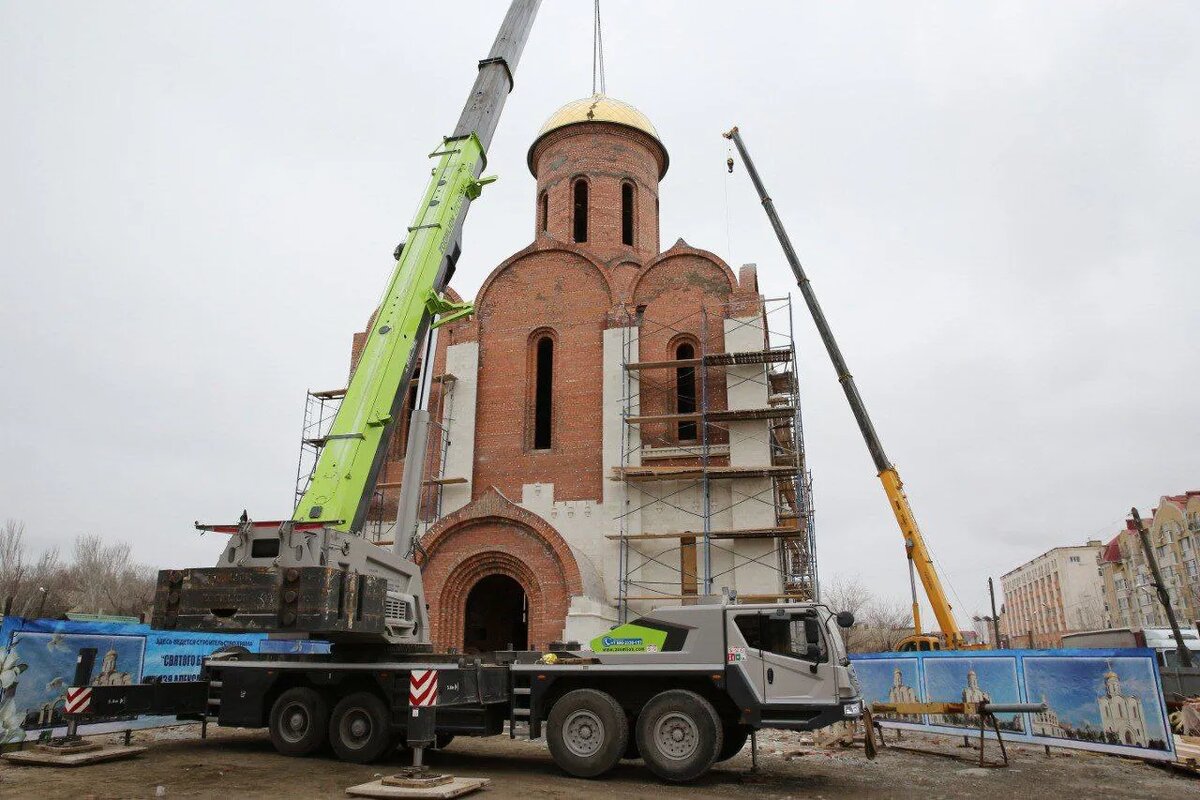 Сегодня на храм святого благоверного князя Александра Невского установили купол из нержавеющей стали, покрытый нитрид титаном, что придает ему золотой отлив. Диаметр купола - 7,5 метров, вес – около 6,5 тонн. Строящийся храм посвящен всем защитникам Отечества. Он станет символом духовной крепости, святости подвига наших воинов.