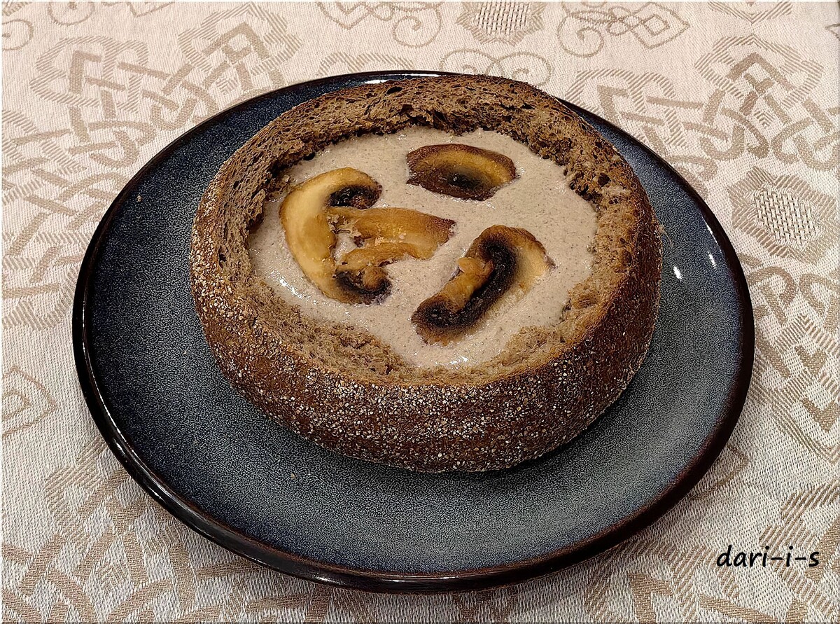 Очень вкусный грибной крем-суп. Еще никто не оставался равнодушным! Принципиально не добавляю картофель, он забивает весь грибной вкус, теряется гастрономическая пикантность. Предлагаю Вам мой вариант этого супа с подачей в хлебной булке: празднично и оригинально. Нам потребуются: На фотографиях двойная порция указанных ингредиентов (выход - около 6-7 литров). Шампиньоны моем и хорошо обсушиваем. Лук режем некрупными кубиками. Грибы нарезаем средне. Несколько крупных грибов оставляем для подачи целиком. Растапливаем в сковороде (здесь я сразу в двух сковородах готовлю) сливочное масло. Обжариваем лук до золотистого цвета. Добавляем грибы и жарим на среднем огне до тех пор, пока они не дадут жидкость и не уменьшатся в размере. Перекладываем грибы в кастрюлю, заливаем водой, доводим до кипения, уменьшаем огонь и варим под крышкой 15-20 минут. Погружным блендером перемалываем содержимое кастрюли в пюре без комочков и кусочков (лучше подольше и тщательнее). Снова ставим на огонь, доводим д