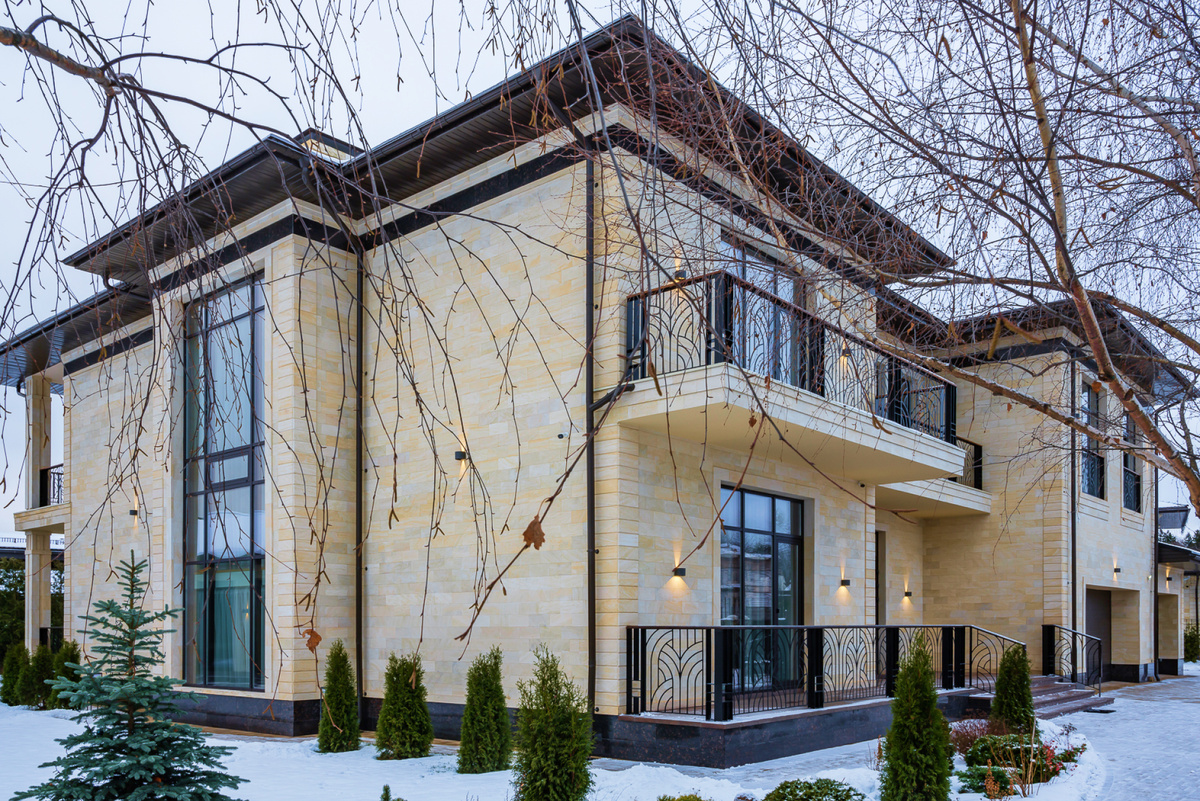 В разработке фасадных решений дома за основу был взят стиль Art Deco. Цветовая гамма основана на контрасте цвета темного шоколада (цвет кровли, цвет мощения террас/балконов и переплета окон) со сливочным цветом фасада дома, выполненным из натурального песчаника.