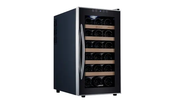 Конструкция шкафа включает компрессор и оснащена дисплеем для легкого контроля температуры. Стеклянные дверцы придают элемент эстетики и позволяют контролировать запасы вина визуально. Внутри расположены две деревянные полки для организации пространства.
