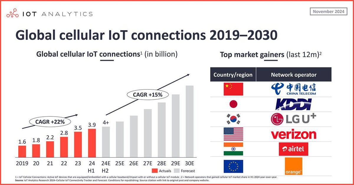 — это примерно 22% от общего числа подключений IoT в мире*. Эксперты прогнозируют, что число подключений будет расти в среднем на 15% в период с 2024 по 2030 год за счет LTE Cat 1 bis и 5G. Для кого это важно? • Для операторов мобильной связи • Для производителей модулей и устройств Производители должны учитывать свои отношения с операторами мобильной связи, чтобы расширить охват рынка и обеспечить бесперебойную интеграцию с новыми технологиями сотовой сети IoT. *По данным обновлённого отчёта Global Cellular IoT Connectivity Tracker & Forecast от IoT Analytics. #ric_iot_news