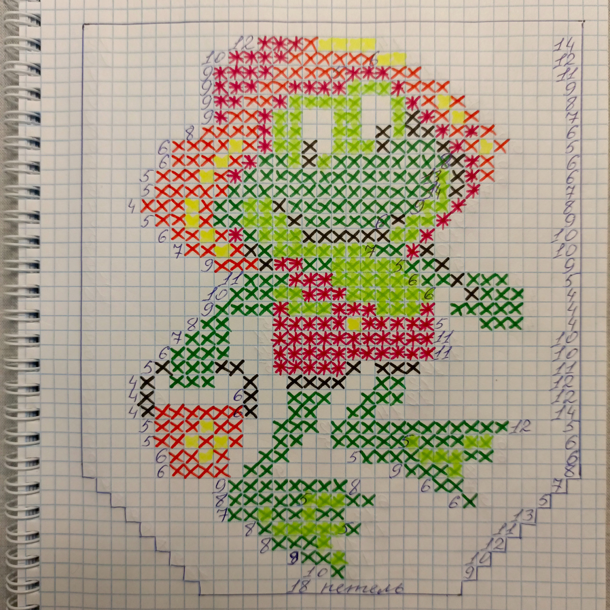 1ряд-набираем косичку из 18 петель. 2ряд-9 осн.1 зел.10 осн. с приб. 3ряд-10 осн.1 салат.2 зел.9 осн. с приб. 4ряд-12 осн.1 салат.3 зел.8 осн. с приб. 5ряд-11 осн.1 зел.5 салат.1 зел.8 осн. с приб. 6ряд-13 осн.2 зел.1 салат.2 зел.1 салат.2 зел.7 осн. с приб. 7ряд-5 осн.1 зел.6 осн.2 зел.3 салат.5 зел.8 осн. с приб. 8ряд-7 осн.2 зел.6 осн.8 зел.9 осн. с приб. 9ряд-8 осн.1 салат.3 зел.9 осн.2 зел.1 осн.4 красн.6 осн. с приб. 10ряд-вяжем без прибавок : 6 осн.2 зел.3 салат.4 зел.5 осн. 2 зел.2 осн.1 красн.1 жёлт.2 красн.6 осн. 11ряд-6 осн.2 салат.3 зел.1 салат.5 зел.2 осн.2 зел.2 осн. 1 красн.1 жёлт.1 красн.1 жёлт.2 красн.5 осн. 12ряд-5 осн.12 зел.1 осн.3 зел.2 осн.2 красн.1 жёлт.3 красн.5 осн. 13ряд-14 осн.2 зел.2 осн.2 зел.2 осн.1 чёрн.6 красн.1 чёрн.4 осн. 14ряд-12 осн.3 зел.2 осн.3 зел.2 осн.1 чёрн.6 осн.1 чёрн.4 осн. 15ряд-12 осн.2 зел.2 осн.4 чёрн.2 осн.1 чёрн.2 осн.3 зел. 1 осн.1 чёрн.4 осн. 16ряд-11 осн.3 чёрн.1 осн.1 чёрн.5 бордо.2 осн.2 чёрн. 3 зел.1 чёрн.5 осн. 17ряд-10 осн.