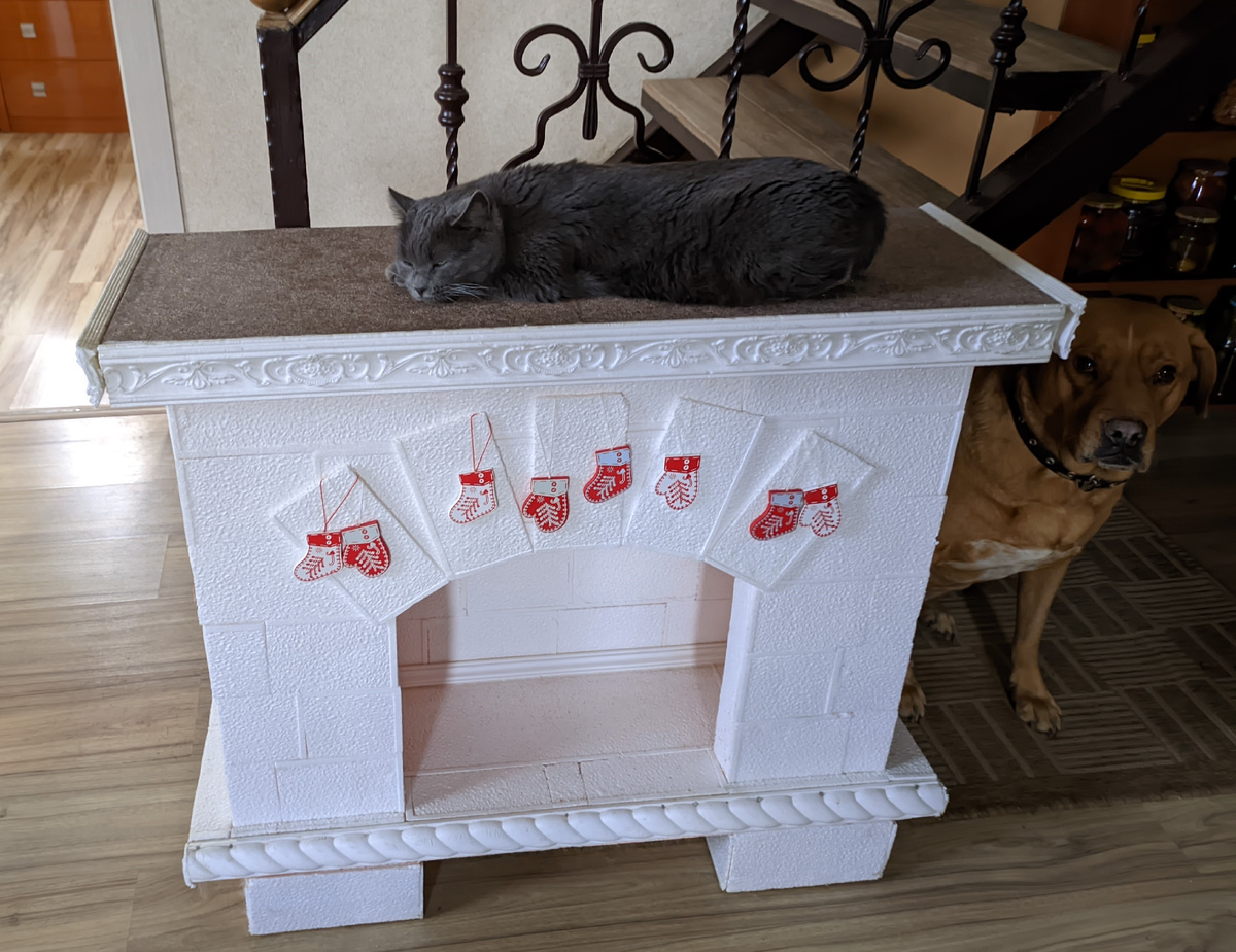 Это наш новогодний бутафорский камин. Его соорудила Светлана, теперь осталось поставить на нём маленькую сверкающую огоньками ёлочку, а сам камин украсить новогодней всякой мишурой и бирюльками.