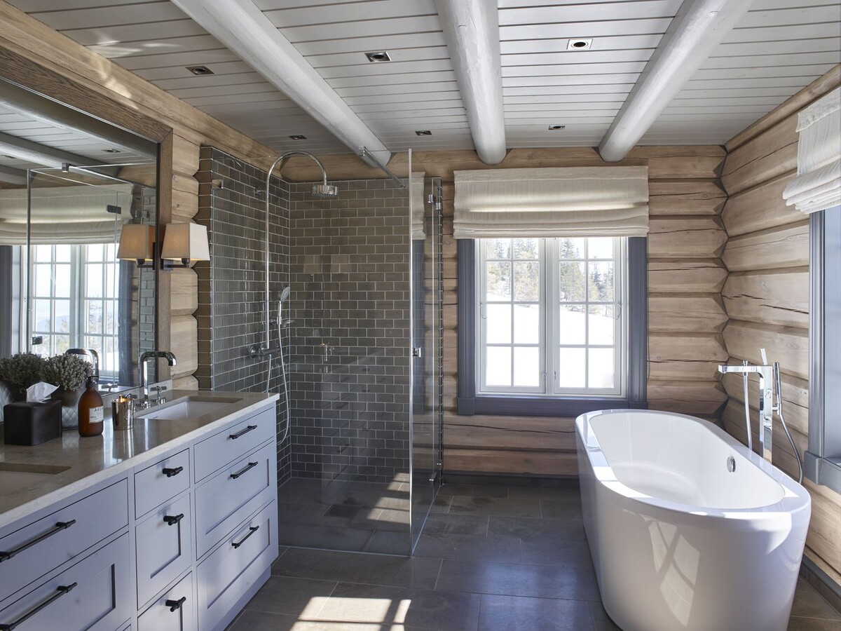 Оформление ванной комнаты должно сочетать природные элементы дома с современными или традиционными акцентами. Подходящие стили: