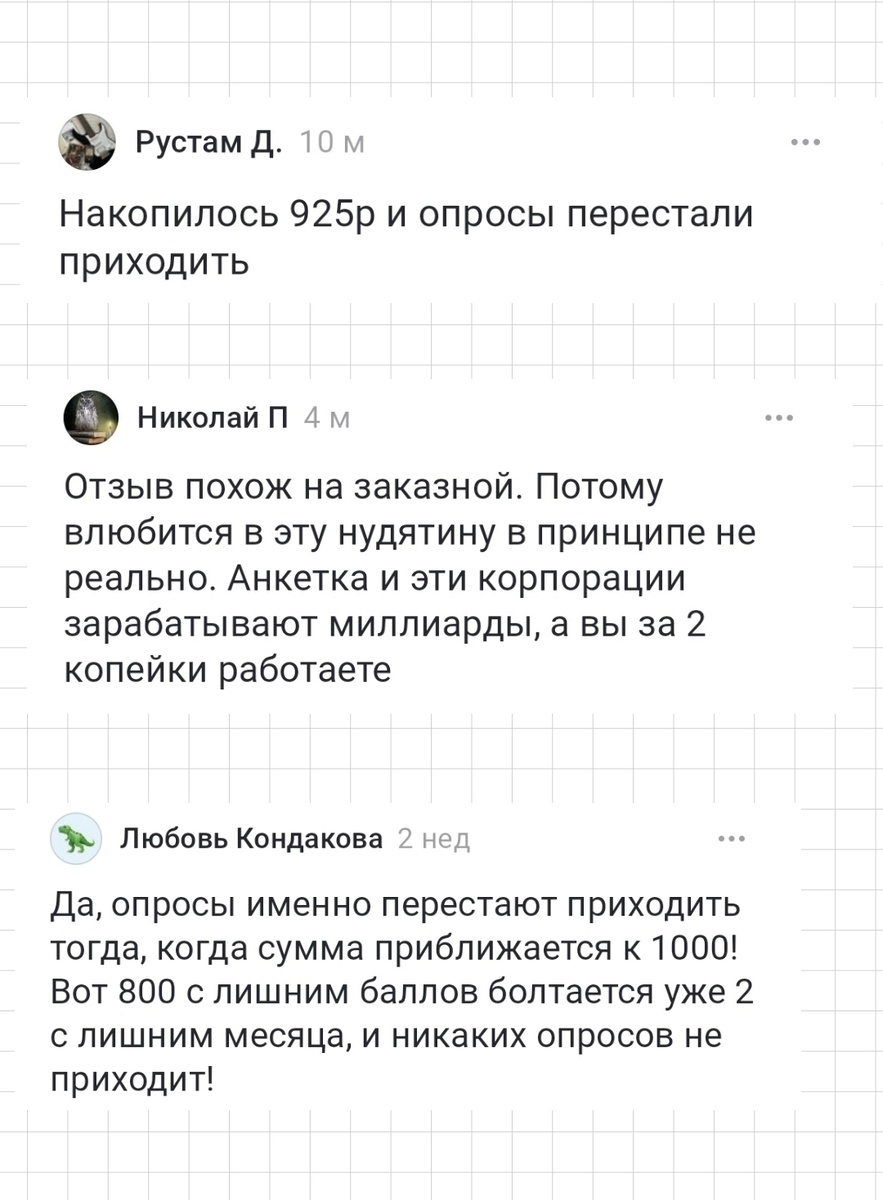 Как-то написала я статью про сайт опросов "Анкетка" и посыпались всякого рода комментарии... Что мол сайт то не платит, что моя статья оказывается заказная) И что как только сумма денег доходит практически до 1000 рублей, то опросы перестают приходить... И любить то я этот сайт не могу) 👇 Хочу сказать, что сайт реально платит и платит исправно, отзывы приходят регулярно. И я этот сайт действительно люблю, хоть и платят копейки) Просто во-первых, надо периодически заходить на сайт, делать хотя-бы вид, что вам интересно и что вы ждёте опросы. Во-вторых, обязательно проходить бесплатные экспресс-опросы и ждать реальные опросы за деньги. Понятно, что опросы не могут приходить к вам каждый день, вы же не одни проходите эти опросы на этом сайте... Ну имейте же терпение и выдержку. У меня сейчас, кстати, тоже накопилось 9️⃣9️⃣0️⃣ рублей. И у меня тоже последний опрос был 18.11.24. Ну и что? Я жду следующий опрос и он обязательно скоро будет. И да, ещё один небольшой совет! 👇 Подпиш