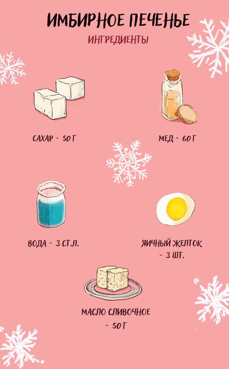 Совсем скоро в каждой квартире на кухне будет много суеты, смеха и новогодней музыки, под которую вся семья приготовит обожаемые ими салаты, закуски, сладости и напитки (да-да, глинтвейн и какао). У вас же тоже ассоциируется новый год с выше перечисленным, да? А нет! Мы забыли про одну вкусность, которая может одновременно и сплотить и создать уютный и приятный вечер — имбирные печенья! Мы обещали рецепт — ловите 😍 Ингредиенты: Сахар — 50 г Мед — 60 г Вода — 3 ст.л. Яичный желток — 3 шт. Масло сливочное — 50 г Мука — 250-300 г Сода — 0.5 ч.л. Имбирь сухой — 2 ч.л. Корица молотая — 2 ч.л. Глазурь Рецепт: В кастрюльке соединяем воду, мёд и сахар. Ставим на маленький огонь и, помешивая, нагреваем до растворения. Желтки аккуратно отделяем от белков и выкладываем в миску. Туда же перекладываем мягкое сливочное масло. Перетираем ингредиенты венчиком до однородности. Тонкой струйкой вливаем остывший сироп к желткам и маслу, одновременно мешая. Пришло время для сухих ингредиентов. Просеивае