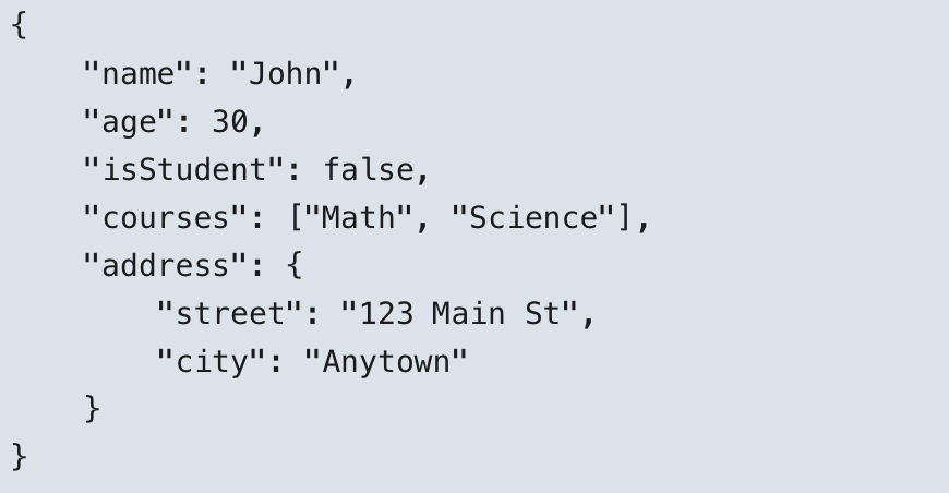 JSON (JavaScript Object Notation) — это легкий формат обмена данными, который легко читается и пишется человеком, а также легко анализируется и генерируется компьютерами. Он основан на подмножестве языка программирования JavaScript, но является независимым от языка, что делает его универсальным для работы с данными в различных языках программирования. JSON представляет данные в виде пар "ключ-значение". Основные структуры данных в JSON: 1. Объекты: Набор пар "ключ-значение", заключенный в фигурные скобки {}. Ключи представляют собой строки, а значения могут быть: Пример объекта: 2. Массивы: Упорядоченный набор значений, заключенный в квадратные скобки []. Значения в массиве могут быть любого типа. Пример массива: JSON широко используется в программировании и веб-разработке по следующим причинам: JSON — это мощный и универсальный формат для обмена данными, который стал стандартом в веб-разработке и программировании. Его простота, читаемость и широкая поддержка языков программирования де