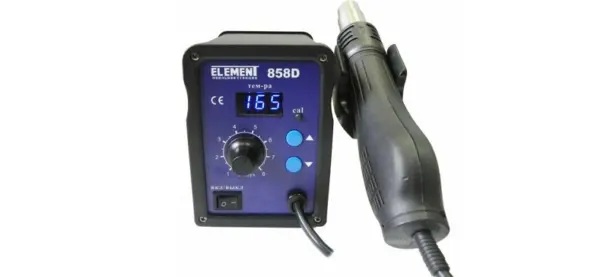 Не менее достойным участником нашего топа является ELEMENT 858D. Паяльный фен выделяется быстрым временем нагрева, всего 5 секунд, что позволяет оперативно начинать работу. Пластиковая рукоятка обеспечивает комфорт и эргономику в эксплуатации. В комплекте идет сам фен, паяльная станция и набор насадок, что делает его универсальным и подходящим для различных задач.