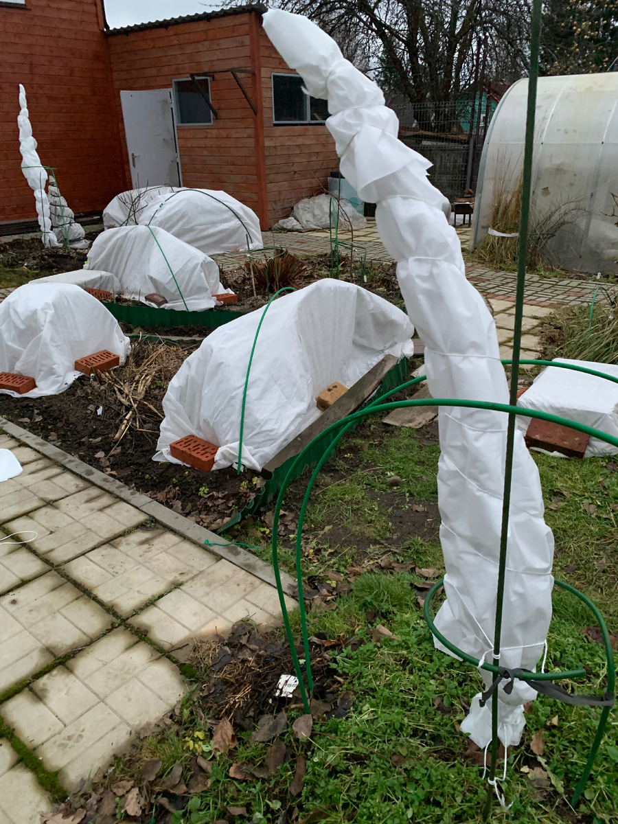 1 декабря завершились работы по укрытию роз. Все цветники с розами укрыты. Абрикосы тоже дождались своего часа и плотно укутаны спанбондом. Саженцы все молодые и поэтому я решила их укрыть. Укрытие готовила из спанбонда плотностью 30 или 42, не обязательно 60, так как принцип был обернуть вокруг саженца несколько раз. Позаботилась и о самых молодых саженцах: персиках , они южные и нет уверенности, что они перезимуют. Но это мы посмотрим в мае. Я укрыла их вместе под один чехол и обвязала веревкой. Все основные работы по укрытию роз и плодовых завершены и можно идти заниматься приготовлением ужина. А на ужин будут быстрые чебуреки. В предыдущем посте я об этом писала. Для начинки я взяла брынзу и зелень , а вторая начинка- фарш индейки и специи. Тесто - это лаваш. Края лаваша смачиваем водой, выкладываем начинку и можно жарить! Чебуреки готовы! Спасибо, что заглянули и прочитали. Всем уютного вечера! Более подробное видео о том как я укрывала можно посмотреть в видео.