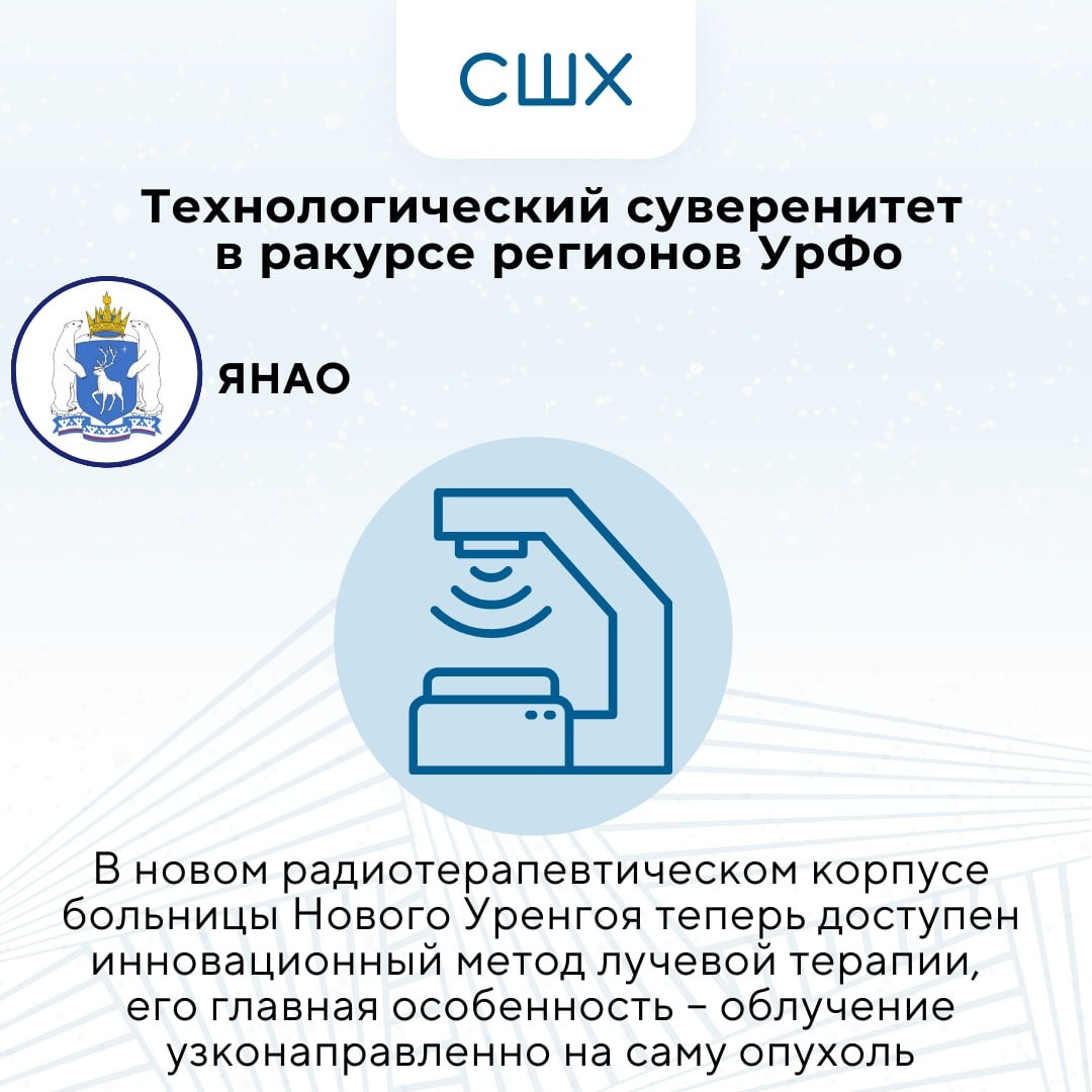 В Ямало-Ненецком автономном округе продолжают наращивать положительные практики внедрения технологий в медицине. Инновационный метод лучевой терапии — лечение под контролем дыхания теперь доступен в новом радиотерапевтическом корпусе больницы Нового Уренгоя. Главная особенность метода — облучение узконаправленно на саму опухоль и не задевает другие органы. В Свердловской области планируют запустить производство кроватей и мягкой мебели на базе уже работающего уральского производителя. Общий объем инвестиций — 150 млн рублей. В перспективе со 100 тысяч единиц мебели в год предприятие вырастет на 30%, что позволит выходить на всю Россию и продавать отечественную мебель на маркетплейсах. В Челябинской области в работу запущен автоматизированный цех для производства специализированных полуприцепов: цистерн, контейнеровозов, сортиментовозов, тяжеловозов, бортовых полуприцепов. Спецтехнику для транспортировки жидких грузов, оборудования в блочно-модульном исполнении для химической, нефтегазо
