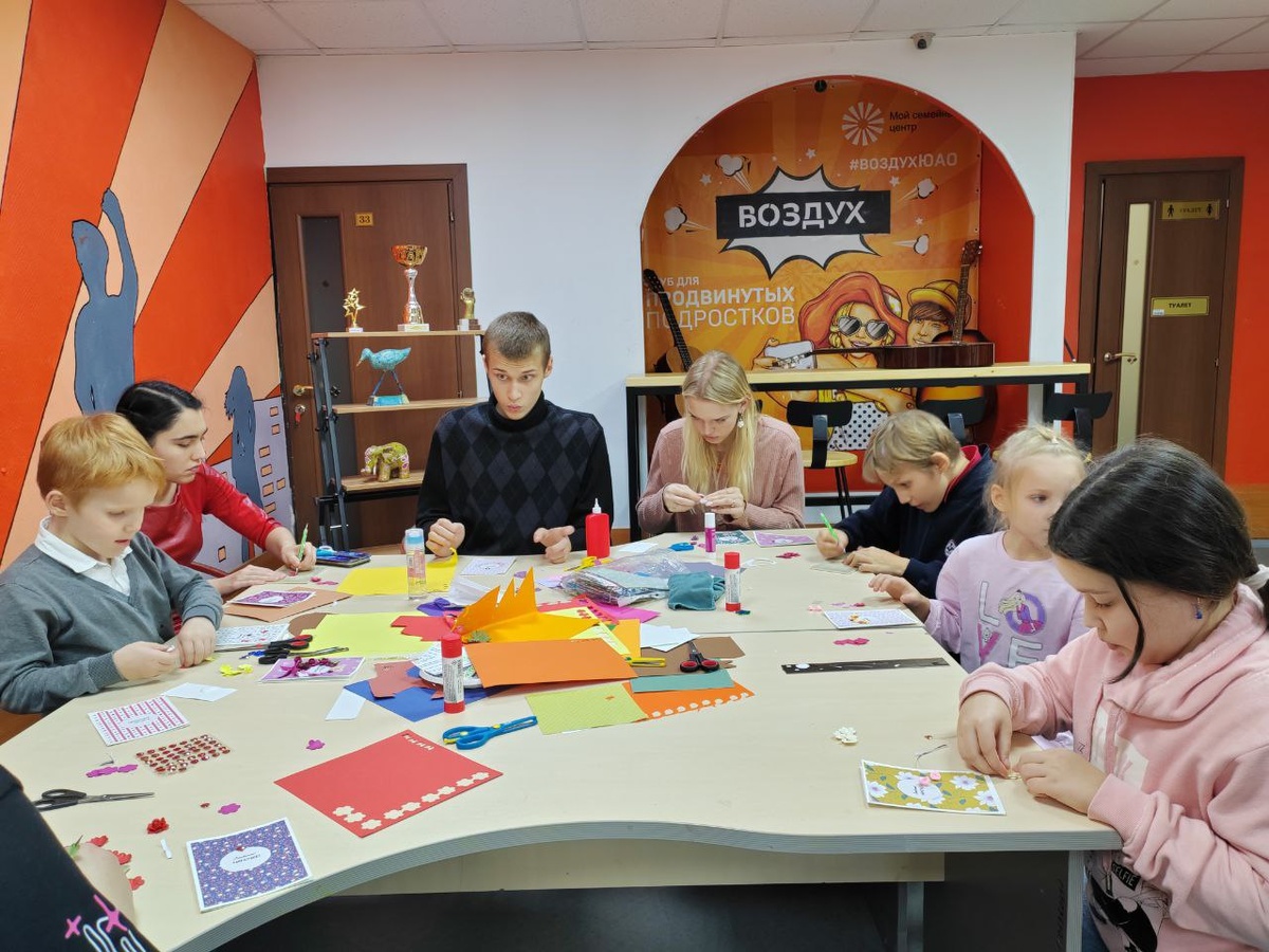 В филиале «Нагатино-Садовники» семейного центра «Планета Семьи» 21 ноября состоялась интерактивная программа, посвященная самым дорогим людям – мамам. В праздничный день прозвучали стихи и музыкальные произведения, прошли шуточные викторины и конкурсы для мам и детей. В завершении вечера ребята изготовили в технике скрапбукинг поздравительные открытки для самого близкого человека. Очень старательно, кропотливо, с любовью дети делали объёмные цветы, бабочек, подбирали цветовые решения, вырезали, скручивали. Открытки получились очень трогательными и красочными!
