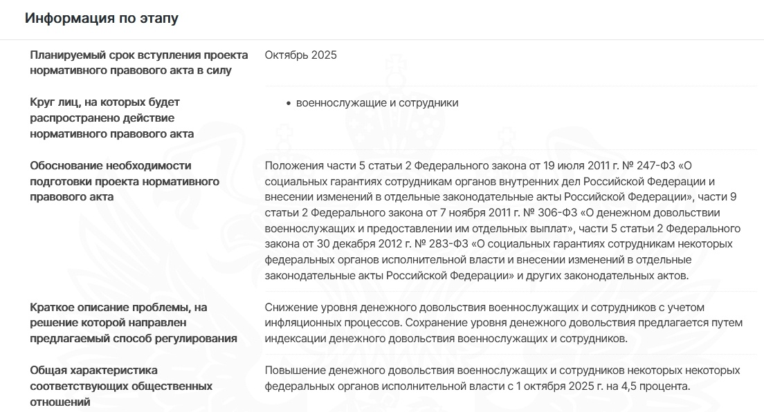 Проект постановления Правительства Российской Федерации О повышении денежного довольствия военнослужащих и сотрудников некоторых федеральных органов исполнительной власти Разработчик: Минобороны России ID проекта: 152620 https://regulation.gov.ru/Regulation/Npa/PublicView?npaID=152620 Общая характеристика соответствующих общественных отношений Повышение денежного довольствия военнослужащих и сотрудников некоторых некоторых федеральных органов исполнительной власти с 1 октября 2025 г. на 4,5 процента. Конечно на фоне того что официально инфляция в стране совсем не 4.5% это выглядит уже не так оптимистично. Госдума приняла закон о федеральном бюджете на 2025 год Подробнее: https://www.garant.ru/news/1768973/ Но. по факту всё-таки ФедЗаконом следует считать его после полного прохождения всех этапов (впереди ещё СовФед и Президент).