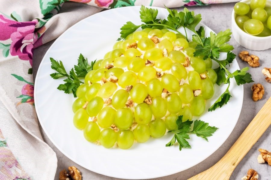 Салат «Виноградная лоза» — это вкусное и яркое блюдо, которое может стать украшением любого стола. Этот салат отличается оригинальным сочетанием вкусов и текстур, а также привлекательным внешним видом. Он готовится из доступных ингредиентов, которые легко найти в любом магазине. Ингредиенты: Приготовление: Отварите куриное филе в подсоленной воде до готовности. Остудите и нарежьте мелкими кусочками. Отварите яйца вкрутую, остудите и нарежьте кубиками. Натрите на крупной тёрке твёрдый сыр. Нарежьте свежий огурец кубиками. Выложите ингредиенты слоями на плоское блюдо, каждый слой смазывая майонезом. Порядок слоёв может быть следующим: куриное филе, яйца, огурец, сыр. Сверху украсьте салат виноградом, разрезанным пополам или целыми ягодами. Приятного аппетита!