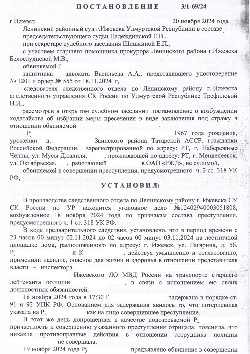 20 ноября 2024 года Ленинский районный суд города Ижевска отказал старшему следователю следственного комитета Ленинского района в ходатайстве об аресте гражданки Р., обвиняемой в совершении преступления, предусмотренного частью 2 статьи 318 Уголовного кодекса Российской Федерации. Я, как защитник, убедил суд в том, что в уголовном деле отсутствуют доказательства причастности Р. к преступлению. Суд отказал следователю в ходатайстве об аресте с формулировкой: «Из представленных материалов и текста предъявленного обвинения не следует, что к потерпевшей было применено насилие, опасное для жизни и здоровья…». Часть 2 статьи 318 УК РФ (Применение насилия в отношении представителя власти) предусматривает наказание в виде лишения свободы на срок до 10 лет. Доводы следователя о том, что Р. не имеет места жительства на территории Удмуртской Республики, не повлияли на решение суда.