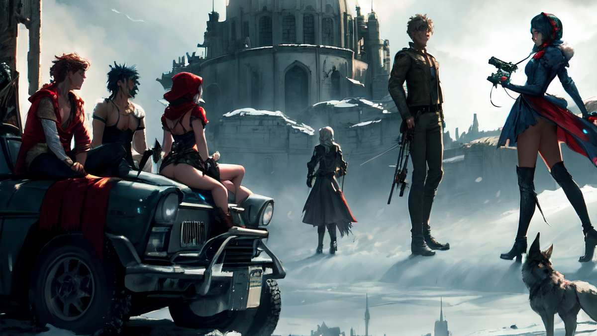Сказочные персонажи в постапокалиптическом мире В мире, где природа поглощена ядовитым смогом, а города превратились в пустоши, герои детских сказок обрели новую, мрачную жизнь. Их невинность заменили суровые реалии выживания, а привычные атрибуты стали оружием и инструментами для борьбы. В этой статье мы погружаемся в их постапокалиптическую трансформацию. Представим, как могли бы выглядеть известные сказочные персонажи, если бы их жизнь протекала среди руин разрушенного мира. --- 1. Золушка – охотница за ресурсами *"A post-apocalyptic Cinderella wearing a rugged, patched outfit made of scavenged fabric and armor plates, wielding a crossbow crafted from an old sewing machine. Her glass slipper is now a high-tech boot with glowing lights, and her hair is tied back into a practical braid. Background: a desolate urban wasteland with towering ruins and scattered debris. Moody lighting, gritty realism, cinematic style."* 2. Красная Шапочка – разведчица в пустошах *"A post-apocalyptic Littl