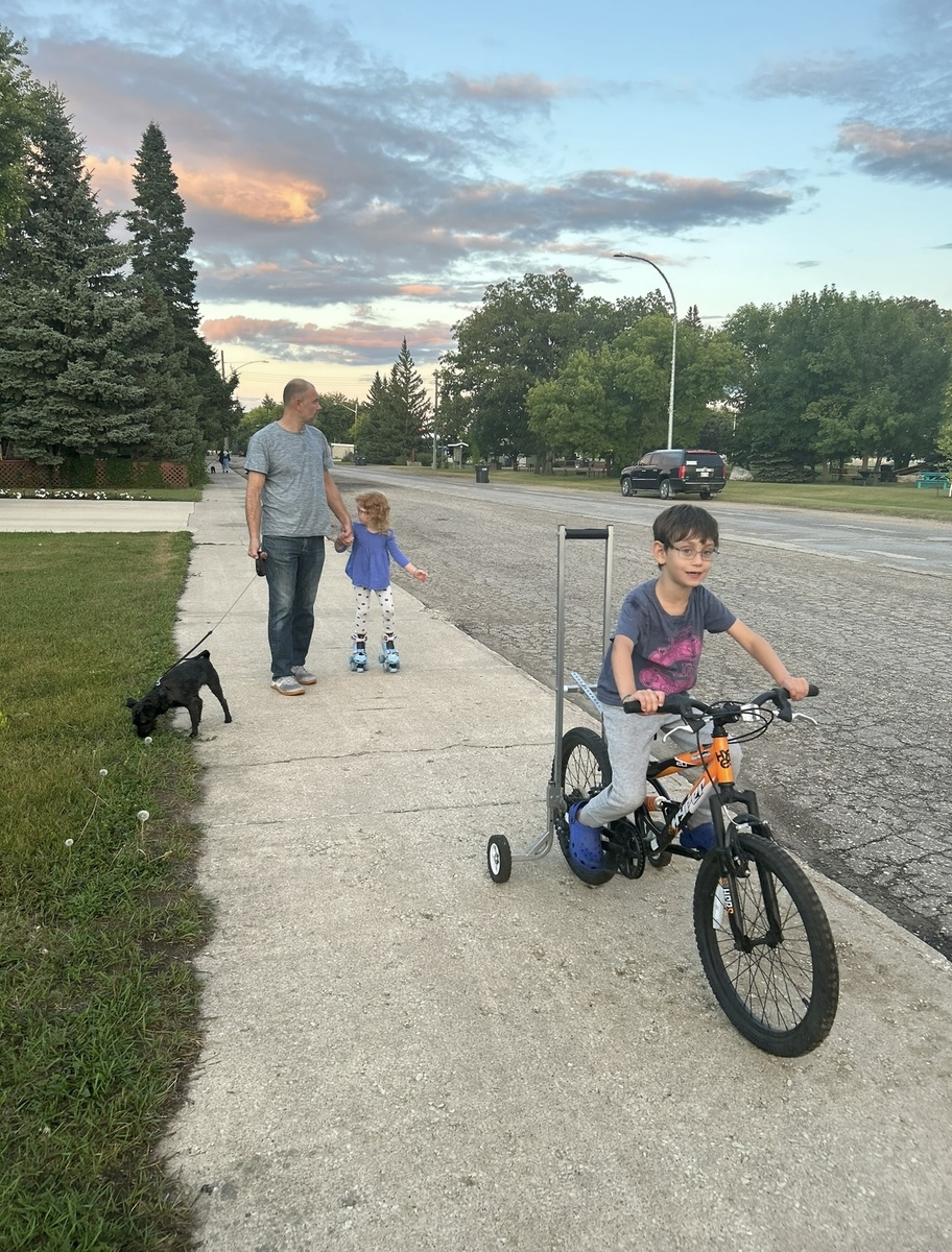 В пять лет, по настоянию нашего социального работника, мы купили Тиму велосипед с приставными колесиками. До этого в нашем доме были беговелы и трехколёсные велосипеды, которые валялись у нас за ненадобностью.