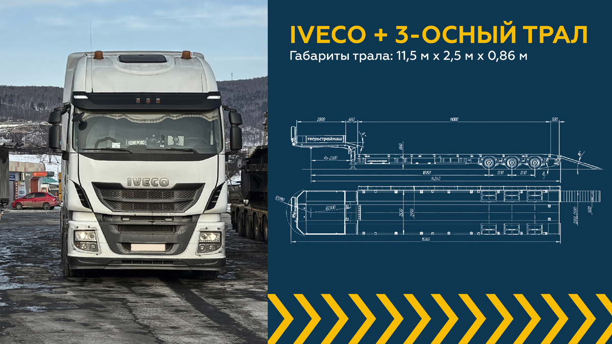 Представляем тягач Iveco с колесной формулой 4x2 — истинный представитель «большой европейской семерки». Грузовик стал нашим верным помощником в доставке грузов разных габаритов и весов! Тягач работает в паре с 3-осным низкорамным тралом. Его характеристики: Габариты трала: 11,5 м x 2,5 м x 0,86 м. Не хотите беспокоиться о доставке? Обращайтесь в «Негабаритор» — мы позаботимся о вашем грузе (https://t.me/negabaritor).
