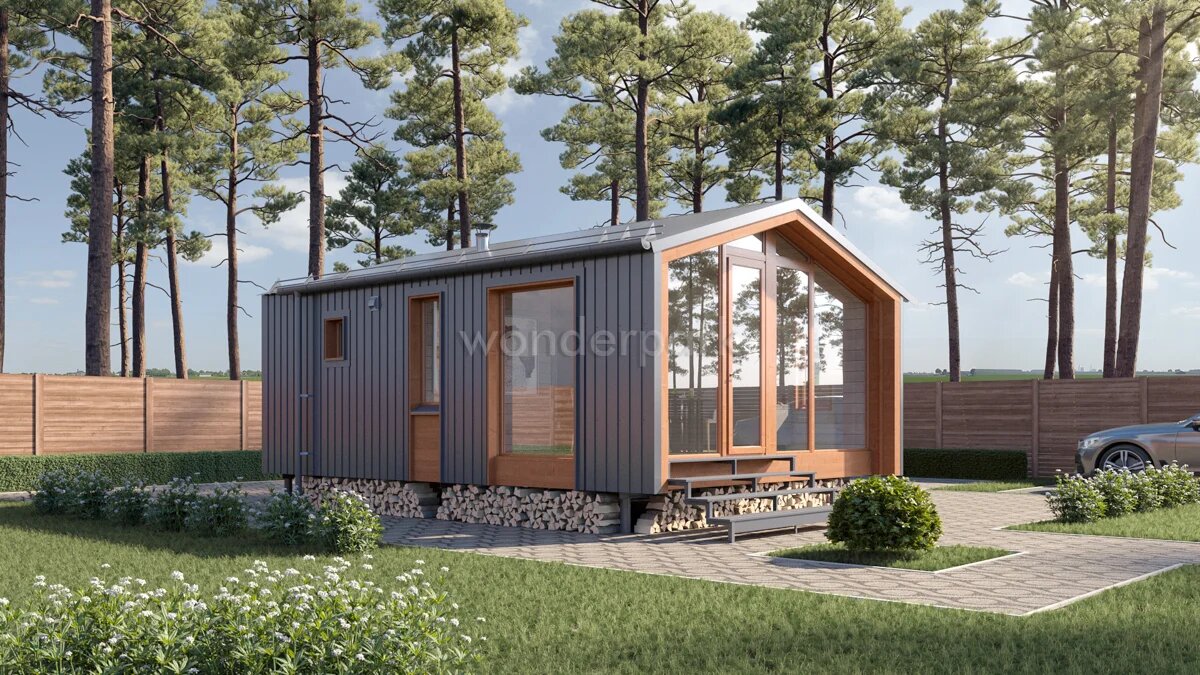 Проект современной модульной бани 6 на 5 метра с панорамным остеклением в стиле barnhouse. Баня может доставляться в готовом виде в составе 2-х модулей на низкорамных манипуляторах. Помещения в бане: Кухня-гостиная, парное, душевая, санузел.