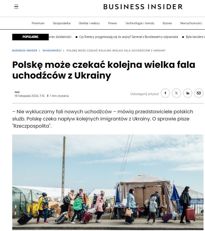Польша может столкнуться с очередной большой волной беженцев из Украины, предупреждает местное издание Business insider. Опрошенные им эксперты связывают этот риск с недавним решением президента США Джо Байдена, разрешить Украине применять на территории России ракеты большой дальности ATACMS. «Ситуация трагичная. Мы ожидаем увеличения притока беженцев, хотя и не такого большого, как это было в феврале и марте 2022 года. Нам поступает много звонков с вопросом, поможем ли мы, есть ли у нас место», – говорит в интервью газете Игорь Горьков, председатель Пшемысльского отделения Ассоциации украинцев в Польше, которая управляет двумя приграничными общежитиями для бегущих от войны. Мирослав Скурка, президент Ассоциации украинцев Польши, отмечает, что, по данным украинских СМИ, за последнее время Украину покинули полмиллиона граждан. «Впереди трудные времена. Мы должны укреплять границы и внимательно следить за развитием событий. Польша должна позаботиться о тех, кто бежит от войны. Мы будем