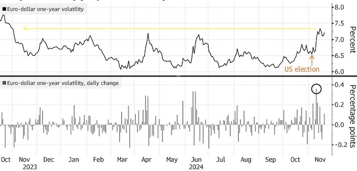 Валютные трейдеры рассчитывают на то, что политическая программа Дональда Трампа спровоцирует рост волатильности на валютном рынке с суточным торговым оборотом $7.5 трлн Волатильность пары евро/доллар. Источник: Bloomberg После нескольких лет спокойных движений показатель годовой волатильности в паре евро/доллар резко вырос. Хедж-фонды скупают опционные контракты, которые приносят прибыль при увеличении валютных колебаний, а стратеги существенно пересмотрели валютные прогнозы. Пока неясно, как быстро Трамп реализует такие меры, как торговые тарифы, которые могут существенно навредить валютам вроде евро, инвесторы почти уверены, что непредсказуемость будет главной особенностью его президентского срока. Реакция стран на меры Трампа, а также последствия этой реакции для рынков — еще один серьезный фактор неопределенности. «В этих обстоятельствах на валютном рынке становится особенно интересно, — сказал Джулиан Вайс, глава отдела ванильных валютных опционов G-10 в Bank of America — «Любой