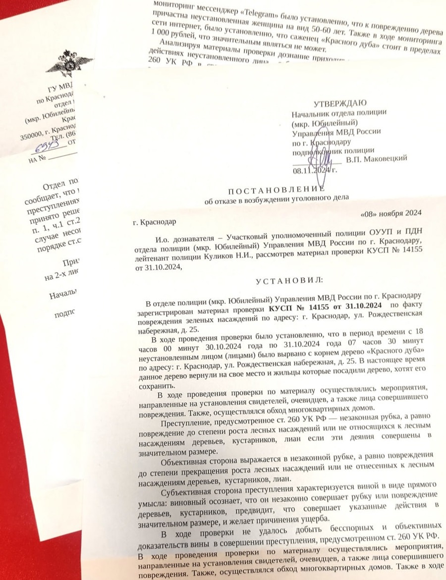 Один из краснодарцев написал заявление в полицию. Но в итоге пришло постановление об отказе в возбуждении уголовного дела по статье 260 УК РФ (незаконная рубка лесных насаждений), так как «в ходе проверки не удалось добыть бесспорных и объективных доказательств вины в совершении преступления, предусмотренного статьей 260 УК РФ».