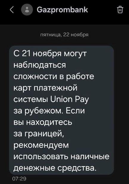 Как минимум два российских банка предупредили своих клиентов о проблемах с работой своих карт UnionPay за границей после введения очередных санкций. Газпромбанк разослал смс с предупреждением, рекомендовав в иностранных государствах использовать наличные деньги. При этом в финансовой организации подчёркивают, что санкции не повлияют на её работу в России. "Все карты нашего Банка, в том числе иностранных платёжных систем, продолжат работать на предприятиях торговли и услуг, а также в банкоматах на всей территории России", — сообщается в телеграм-канале банка. Аналогичные предупреждения разослал и Примсоцбанк. Там также заявили, что санкции не влияют на работу банка и сервисов, но ввели ограничения на переводы в иностранной валюте. "Банк приостанавливает приём переводов в иностранных валютах до получения новых правил и требований от иностранных банков-корреспондентов", — говорится в сообщении. Помимо Газпромбанка и Примсоцбанка карты китайской платёжной системы UnionPay в России эмитирую