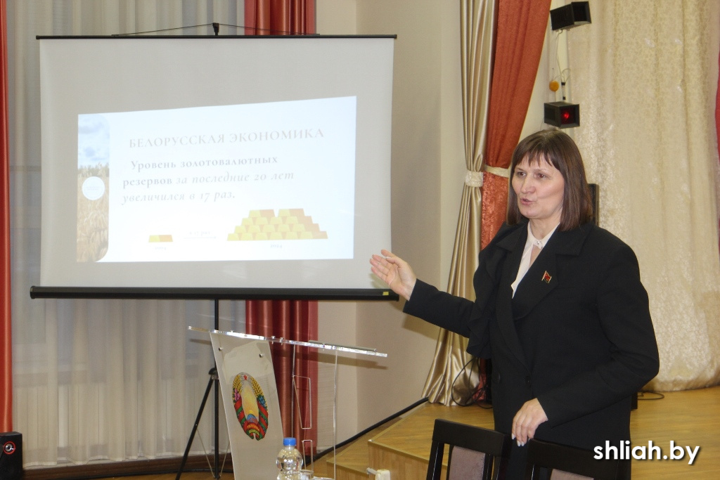 На встрече с районным активом ОО «Белорусский союз женщин» заместитель начальника главного управления идеологической работы и по делам молодежи облисполкома, председатель областной организации ОО «Белорусский союз женщин» Ирина Степаненко, которая также является членом Высшего политического совета Белорусской партии «Белая Русь», представила проект «Президентская республика». Проект Белорусской партии «Белая Русь» стартовал во время предвыборной кампании. Ирина Брониславовна с помощью презентации рассказала о достижениях нашей страны за последние 30 лет. Оксана ГЕЙБОВИЧ Фото автора
