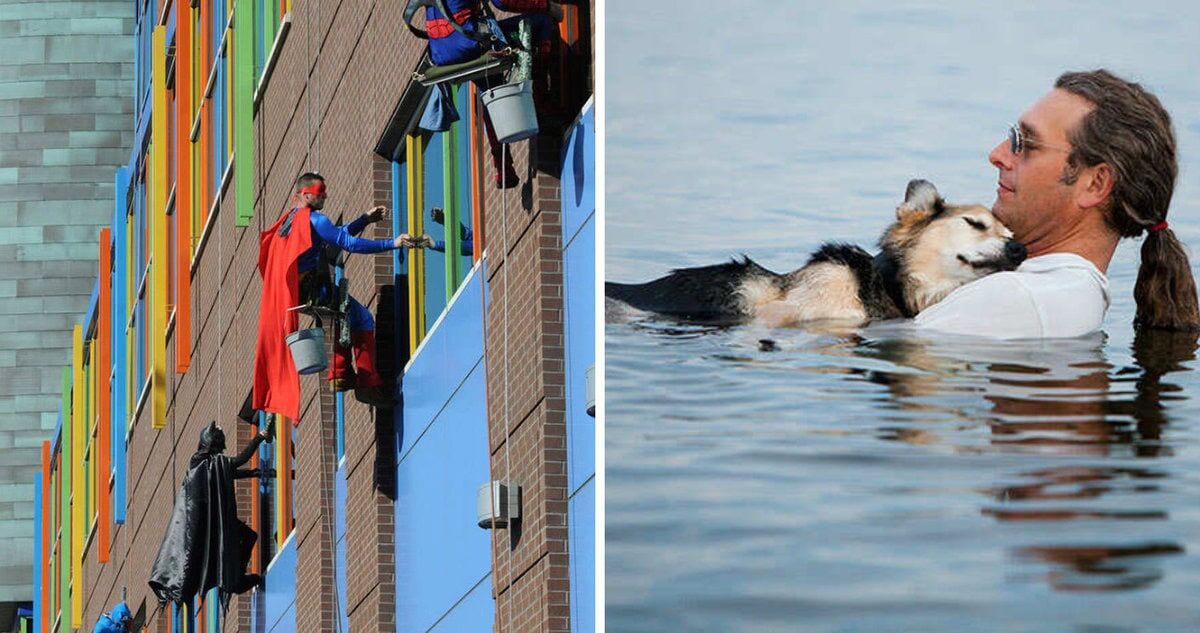 На улицах города могут быть мрачные дни, супергерои всегда на посту. Эти "мойщики окон" знают, как порадовать детей и взрослых своим подвигом.