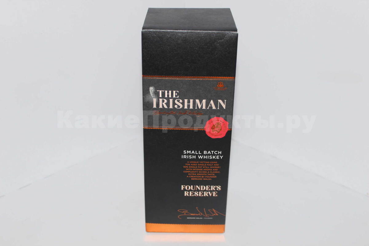 The Irishman Founder’s Reserve — это ирландский виски, представляют из себя купаж спиртов пот стилл и сингл молт. Этот виски имеет крепость 40%. Выдержка 8 лет.