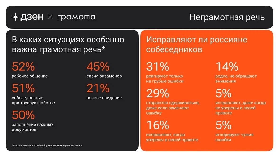 Ко Дню словаря контентная платформа Дзен и портал «Грамота.ру» опросили россиян и узнали, в какой ситуации для них важнее всего грамотная речь и какие слова чаще всего используют в неверном контексте. Согласно исследованию, большинство россиян считает грамотную коммуникацию ключевым фактором в рабочем общении — об этом заявили 52 % респондентов. На втором месте по важности оказались собеседования при трудоустройстве (51 %), а на третьем — заполнение важных документов (50%). Треть россиян старается сдерживаться и не поправлять собеседника. Еще треть опрошенных реагируют только на грубые ошибки. При этом 16 % респондентов постоянно исправляют собеседника, если уверены в своей правоте, а 5% делают это даже тогда, когда не знают верного ответа. Наибольшее раздражение у россиян вызывают ошибки или неграмотная речь блогеров — этот вариант выбрали 60 % респондентов. На втором месте оказались государственные служащие: их неграмотность расстраивает 58 % участников опроса. Ошибки коллег раздраж