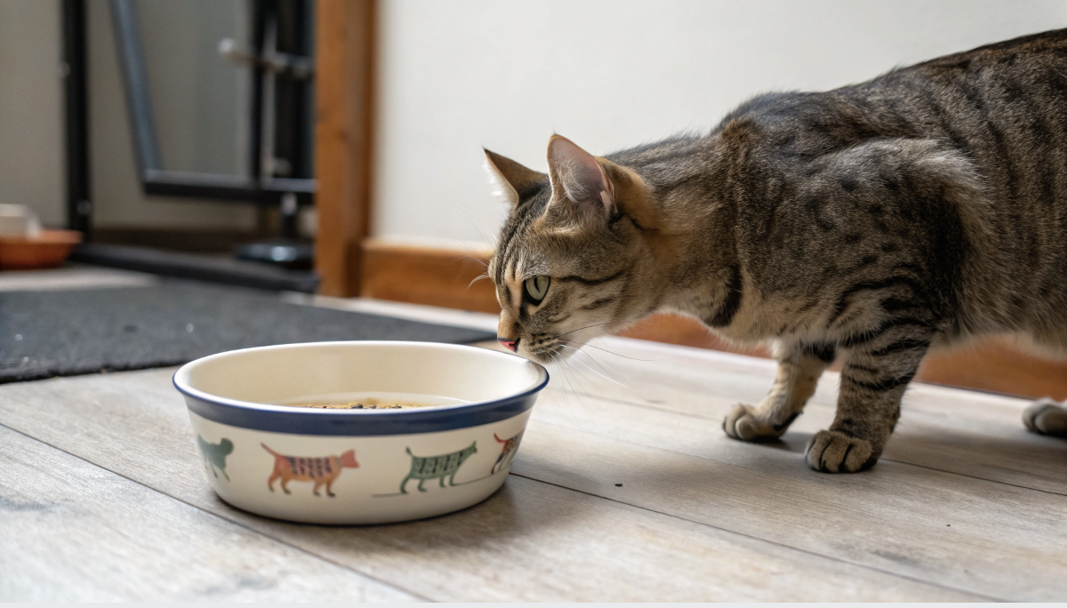 - Кошка подходит к миске, но не ест