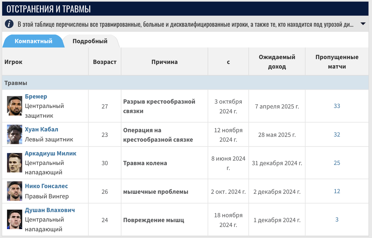 Список травмированных среди состава Тьяго Мотты еще ни разу не пустовал с момента его приезда. Сперва были небольшие физические проблемы у новичков Василя Аджича и Тена Коопмейнерса, параллельно Арек Милик переживал насчет операции из-за травмы, полученной в стане сборной в первой же игре. Затем с мышечными болями по очереди стали валиться Фаджоли, Локателли и Веа, Тюрам вывихнул лодыжку, Веа получил болезненный ушиб щиколотки, Гонсалес надорвал мышцу в области левого бедра, Бремер и Кабаль по очереди порвали кресты, Душан Влахович переутомился и поймал судороги во время перерыва на игры сборных, Луис все никак не привыкнет к текущим нагрузкам и не поймает искомый ритм, что сказывается на его физическом состоянии, ну и так далее.