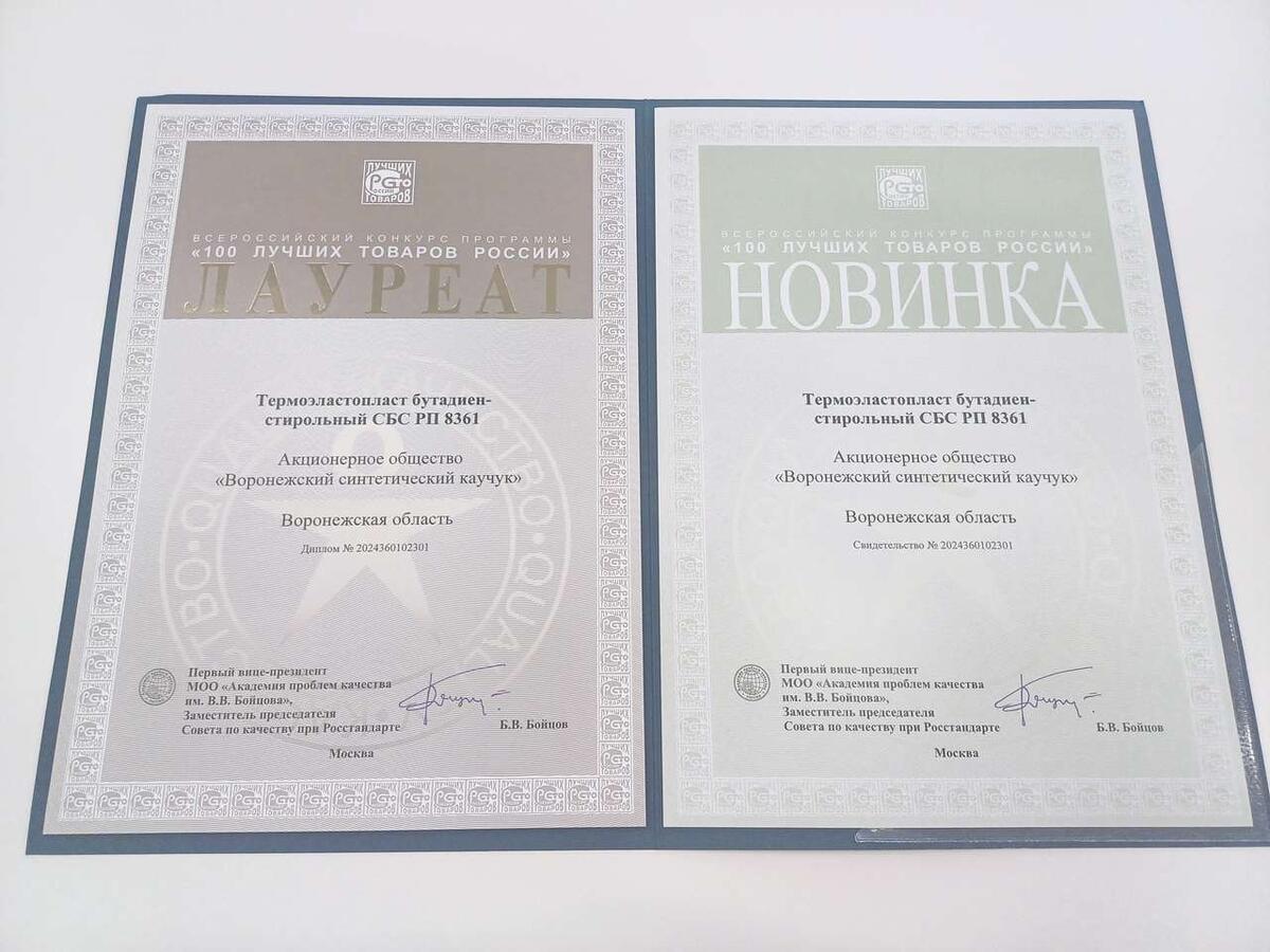 Воронежское предприятие СИБУРа – победитель Всероссийского конкурса «100 лучших товаров России». Знак отличия, декларацию качества и дипломы вручили руководству «Воронежсинтезкаучука» в правительстве Воронежской области. Наградой отмечена марка СБС-полимера РП 8361, которая благодаря своим качествам используется в производстве обуви, детских игрушек и других потребительских товаров. Данная марка на конкурсе получила и второй диплом «Новинка-2024» как новый вид продукции. СБС-полимер — это бутадиен-стирольный термоэластопласт, обладающий свойствами каучука и способностью перерабатываться как пластик. Он является важнейшим компонентом при производстве асфальтового дорожного покрытия, кровельных материалов, обуви, потребительских товаров (клеев, шлангов, детских игрушек, липких лент, этикеток, канцелярских товаров, гибких кабелей, изоляции и т. д.). Новая марка СБС-полимера - разработка научно-исследовательского центра «Полилаб Воронеж» («Воронежсинтезкаучук»). Научно-исследовательский це