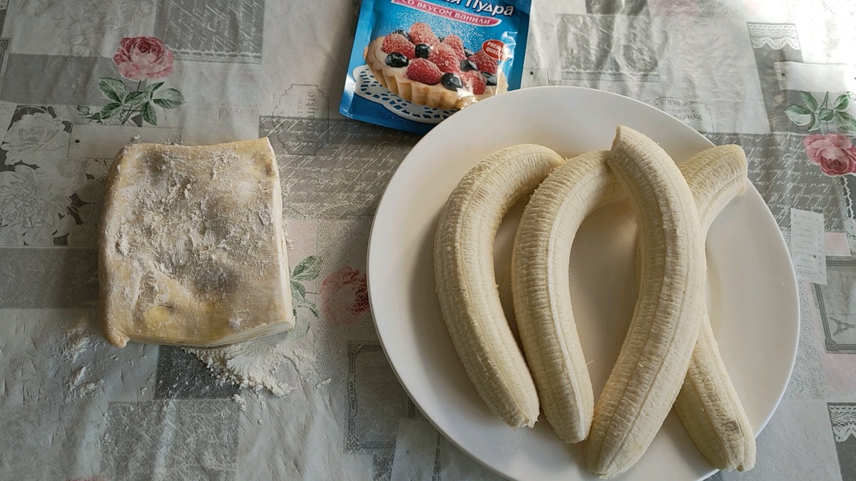 Очень простая выпечка из двух ингредиентов. Понадобится 3-4 банана, 250 грамм слоёного теста, по желанию сахарная пудра для подачи. Очистить бананы Раскатать тесто толщиной в 1,5 мм Нарезать на полоски, шириной в 1,5 - 2 см Завернуть полосками бананы Переложить на противень, застеленный пергаментной бумагой Выпекать 20-25 минут при 180 градусах Украсить сахарной пудрой и подавать Подробнее на видео Источник: канал "4етыре ложки" на You Tube