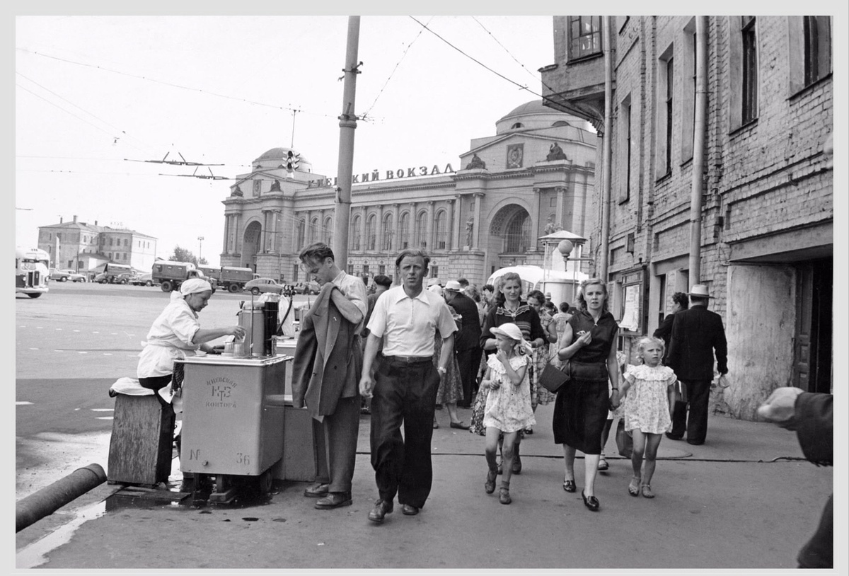 Давайте совершим очередное путешествие сквозь время, прогуляемся по улицам родного города, посмотрим, каким он был тогда и что изменилось за прошедшие десятилетия. Поехали! ... Москвичи и гости столицы у Киевского вокзала. Это вид в сторону привокзальной площади от Большой Дорогомиловской улицы. Обратите внимание на справа на переднем плане и вдали, слева от вокзала. Фото 1959 года, Дон Ханштейн Вид с этой точки теперь. Киевский вокзал на том же месте, а вот дом справа, вместе с целым кварталом, снесли в семидесятых годах, после чего был обустроен сквер, на месте которого в новейшей истории построили большой ТЦ, он за кадром. Исчез дом и слева от вокзала, там с девяностых годов стоит гостиница А это 2-й Брянский переулок уходящий от Киевского вокзала к Большой Дорогомиловской улице. Здесь тогда ещё ходили трамваи, а справа стоял квартал, которые снесут в семидесятых. Фото 1958 года, Андрас Репей Сейчас переулок выглядит кардинально иначе, застройка изменилось и здесь, и на Большой Доро