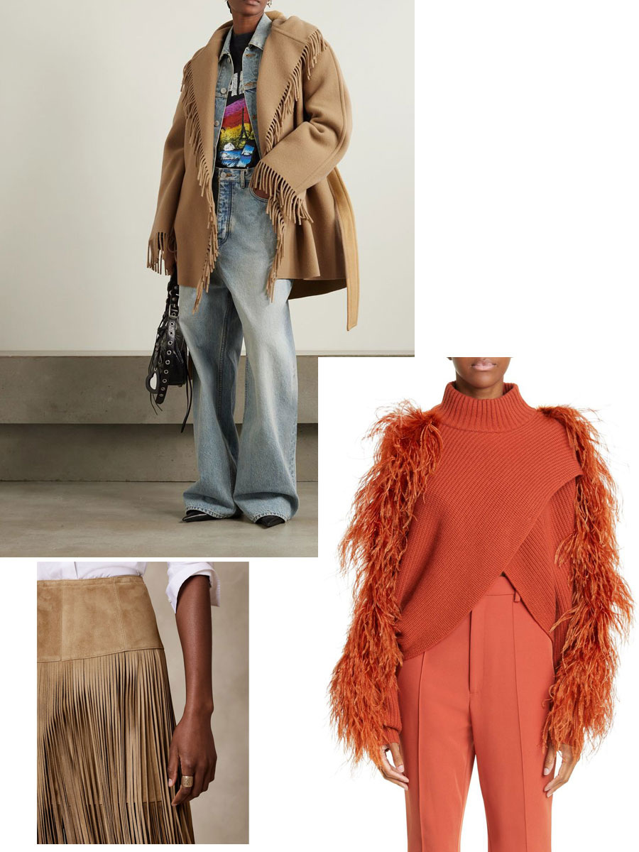Бахрома на одежде — один из главных трендов сезона. Этот декоративный элемент добавляет образу игривости и выразительности. Бахрома украшает всё: от платьев и брюк до сумок и обуви. В зависимости от настроения выбирайте длинные объемные или утонченные варианты, создавая как повседневные, так и вечерние образы.