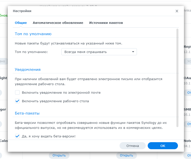 В начале процесса установки, система предупредит что пакет не проверялся компанией Synology, принимаем условия.