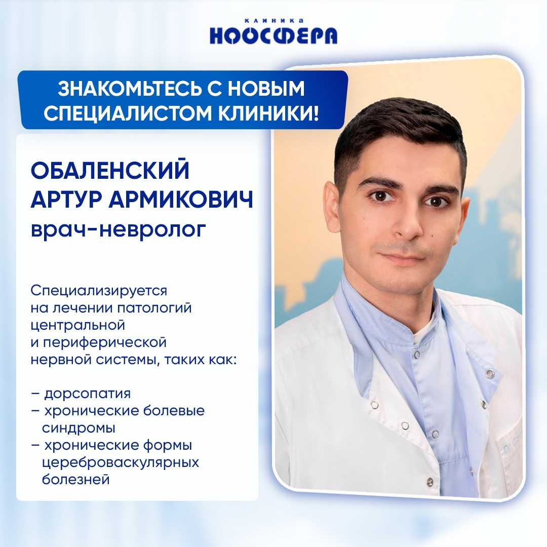 Мы рады представить нового члена команды клиники «Ноосфера» — Артура Армиковича Обаленского, врача-невролога с опытом работы более 7 лет, который будет помогать вам решать проблемы с нервной системой и возвращать здоровье и активность в вашу жизнь. 🎓 Образование и опыт Артур Армикович — выпускник Ростовского государственного медицинского университета, где он также прошел интернатуру по специальности «Неврология». В своей практике он использует индивидуальный подход, сочетая новейшие методики лечения и глубокое внимание к деталям, благодаря чему уже сотни пациентов доверяют ему свое здоровье. Артур Армикович специализируется на лечении заболеваний центральной и периферической нервной системы, таких как: ✅ Дорсопатия — заболевания позвоночника, приводящие к болям и ограничению подвижности. ✅ Хронические болевые синдромы, которые нарушают повседневную жизнь. ✅ Цереброваскулярные болезни — патологии, связанные с нарушением кровообращения в мозге, включая хронические формы. Что ценят па