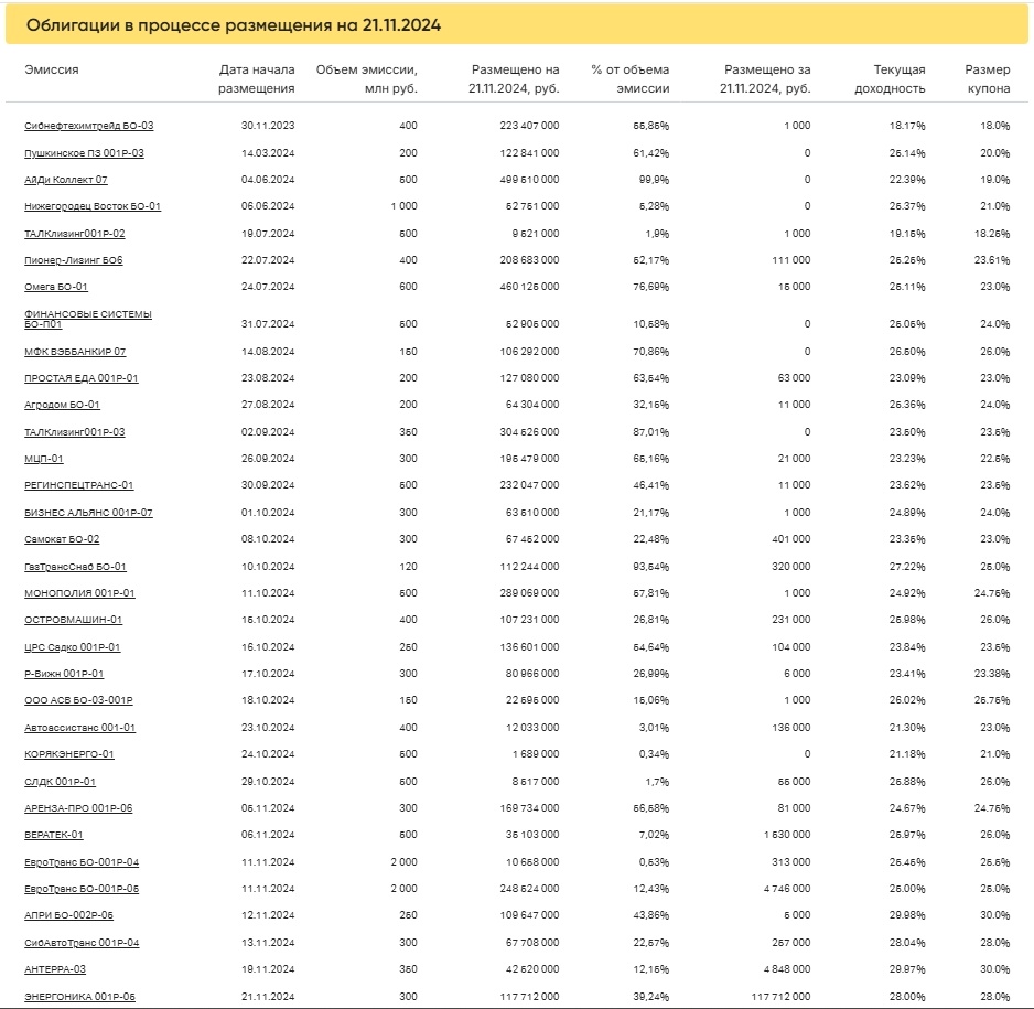21 ноября стартовало размещение ЭНЕРГОНИКА 001Р-05. Выпуск объемом 300 млн был размещен на 117 млн 712 тыс. рублей (39,24% от общего объема эмиссии). Суммарный объем торгов в основном режиме по 454 выпускам составил 944,0 млн рублей, средневзвешенная доходность — 22,01%. 📊 Подробнее в ВДОграфе Больше актуальных новостей читайте оперативно в нашем телеграм-канале