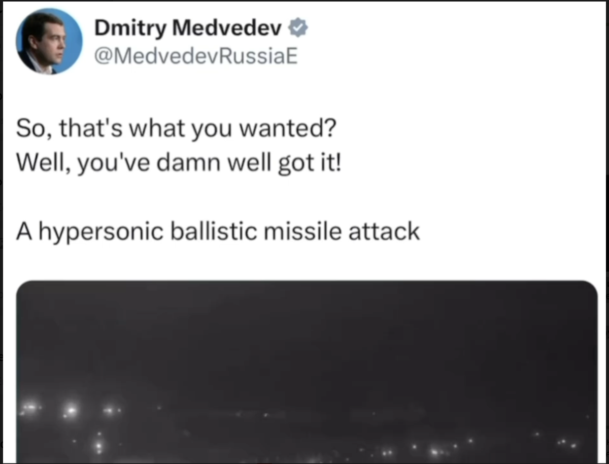 "Так вот чего вы хотели? Ну, вы, черт возьми, получили это! Атака гиперзвуковой баллистической ракетой» - написал на своей странице в соцсетях Илона Маска зампред Совбеза РФ Дмитрий Медведев после заявления Владимира Путина о применении баллистической ракеты «Орешник». «Нет, это не то, чего мы (Америка) хотели. Или вы не заметили убедительного исхода наших выборов в этом месяце?» - люди из всех уголков мира начали массово отвечать под этим постом российскому зампреду. «Как живущий в США 28-летний мужчина скажу: практически все, кого я знаю, относятся к России с уважением. Нам нужен мир. Нераскрытый потенциал нашей планеты огромен, если только мы не будем стараться уничтожить друг друга, а сможем работать вместе, делая будущее лучше». «От имени Кении: мы не хотим вступать с вами ни в какую войну и заранее приносим извинения, если в будущем кто-либо из наших лидеров займёт сторону в текущем военном конфликте, спасибо. С уважением, граждане Кении».