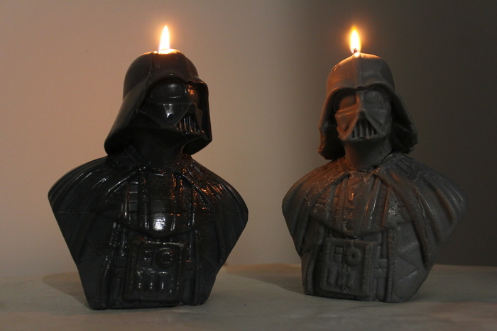 Здравствуйте читатели! Сегодня я хочу поделиться изготовлением новой свечи. На этот раз захотелось сделать свечу по облику темного лорда ситха (или сита??) - Дарта Вейдера. Процесс изготовления стандартный, который уже неоднократно описывал в своих постах, но ещё раз повторюсь (стоит ли процесс производства выкладывать в дальнейшем, так как технологию изготовления я уже описывал в своих предыдущих постах?) Для начала нужно выбрать форму (мастер-модель) для свечи. В качестве формы выбрал данную гипсовую статуэтку: Затем необходимо сделать силиконовый молд по данной статуэтке. Использовал двухкомпонентный силиконовой раствор на основе олова, с твердостью по "шору" 20. Затем смешиваем компонент А и компонент В в пропорции 100 к 2.5. Статуэтка большая и с опалубкой возникли проблемы. Вначале я ее сделал из картона, но по итогу склейка дала трещину и силикон вытек...неприятная была ситуация. Силикон сложно оттирается и он очень липкий. Так что спирт вам в помощь) Во второй раз использовал п