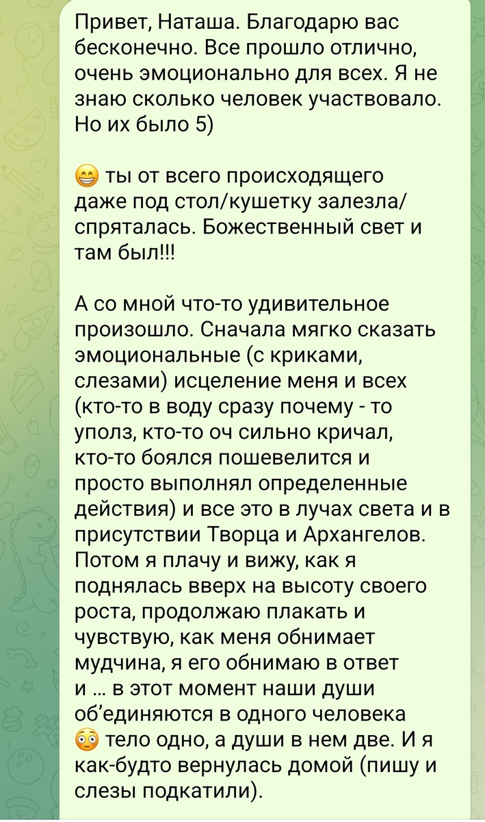 Вчера на Групповом Процессе мы провернули очень мощную работу. Мы разбирали тяжелейшую историю, и поэтому я попросила присоединиться к работе всех, кто мог. Судьбы целителей они такие, да. Непростые частенько, пока ребус не разгадан. Мы сшивали и собирали поле 4,5 часа. Возвращали фрагменты душ предков, выпускали блоки, латали расколы и отпускали призраков прошлого. Работали вслепую. Заказчица не видела запись, но утром написала, что происходило на тонком плане с ее стороны. Во время работы она молилась за всех нас. И вот это все ей пришло из поля в процессе. Расстановки ясновидящими ясновидящим они такие. Все всем видно 💚.