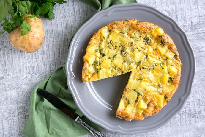 Фритата с картофелем — это итальянское блюдо, которое представляет собой омлет с начинкой. В данном случае начинкой служит картофель. Фритата отличается от обычного омлета более плотной текстурой и хрустящей корочкой. Ингредиенты: Приготовление: Очистите и нарежьте картофель тонкими кружочками или кубиками. Разогрейте сковороду с растительным маслом на среднем огне. Обжарьте картофель до полуготовности, примерно 5–7 минут. Взбейте яйца в миске, добавьте соль, перец и зелень по вкусу. Залейте картофель яичной смесью и готовьте на среднем огне, пока омлет не схватится. Посыпьте фритату тёртым сыром и готовьте ещё 2–3 минуты, пока сыр не расплавится. При желании можно добавить нарезанную ветчину или другие ингредиенты по вкусу. Подавайте её горячей, можно с салатом или овощами. Приятного аппетита!